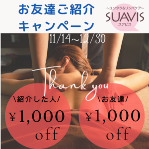 沖縄県うるま市にある看護師アロマリラクゼーションサロン SUAVIS です♪ 日頃の感謝を込めて… ご紹介者・そのお友達には一人1000円割引させていただきます。*新規様限定 どんどん紹介して、割引で癒されに来てください […]