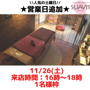 沖縄県うるま市にある看護師アロマリラクゼーションサロン SUAVIS です♪ 当店は土日のご予約が大人気♪ 『仕事終わりに来たい!』との要望が多くありましたので、営業時間を一部追加いたしました。 11/26(土) ・ 1 […]