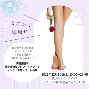 沖縄県うるま市にある看護師アロマリラクゼーションサロン SUAVIS です♪ 今月も当店で人気セミナー開催! 今回のテーマは【美脚について】 当店のお客様にも下半身が気になる方や、二の腕・背中・お腹など全身の贅肉が気にな […]