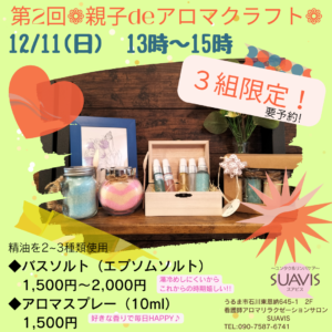 沖縄県うるま市にある看護師アロマリラクゼーションサロン SUAVIS です♪ R4.12/11(日)当店で親子でクラフト体験を開催!3組限定♪ 寒いこの時期にはもってこい♪子ども達が楽しく作って遊んで♪ 【バスソルト作り […]