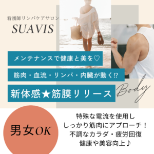 沖縄県うるま市にある看護師アロマリラクゼーションサロン SUAVIS です♪ 8月〜新メニュー導入につきまして!モニター様を大募集します! リンパケアだけではなく、特殊な電流で筋肉・血行・内臓をも動かす‼今 […]